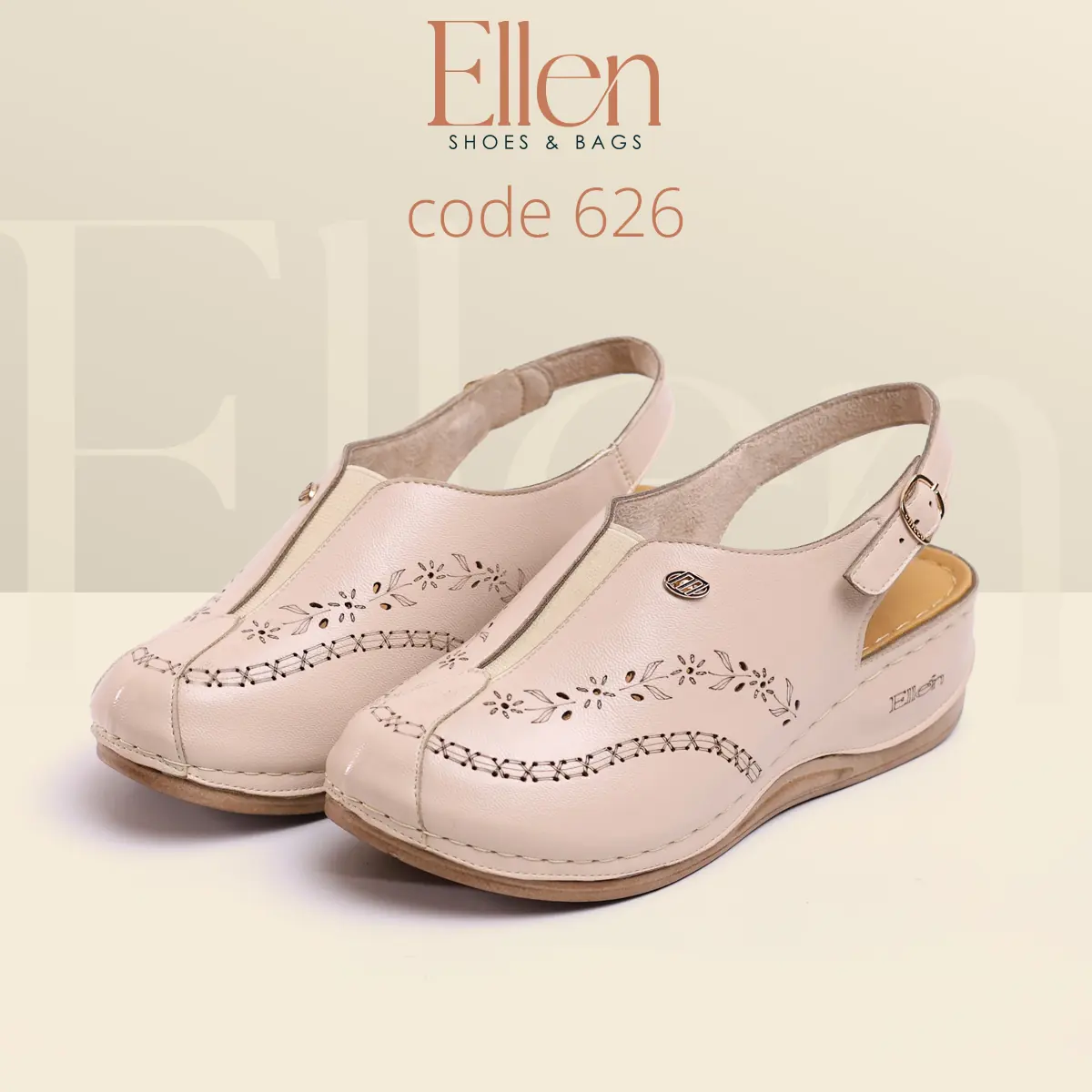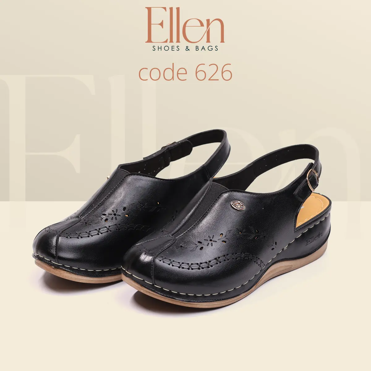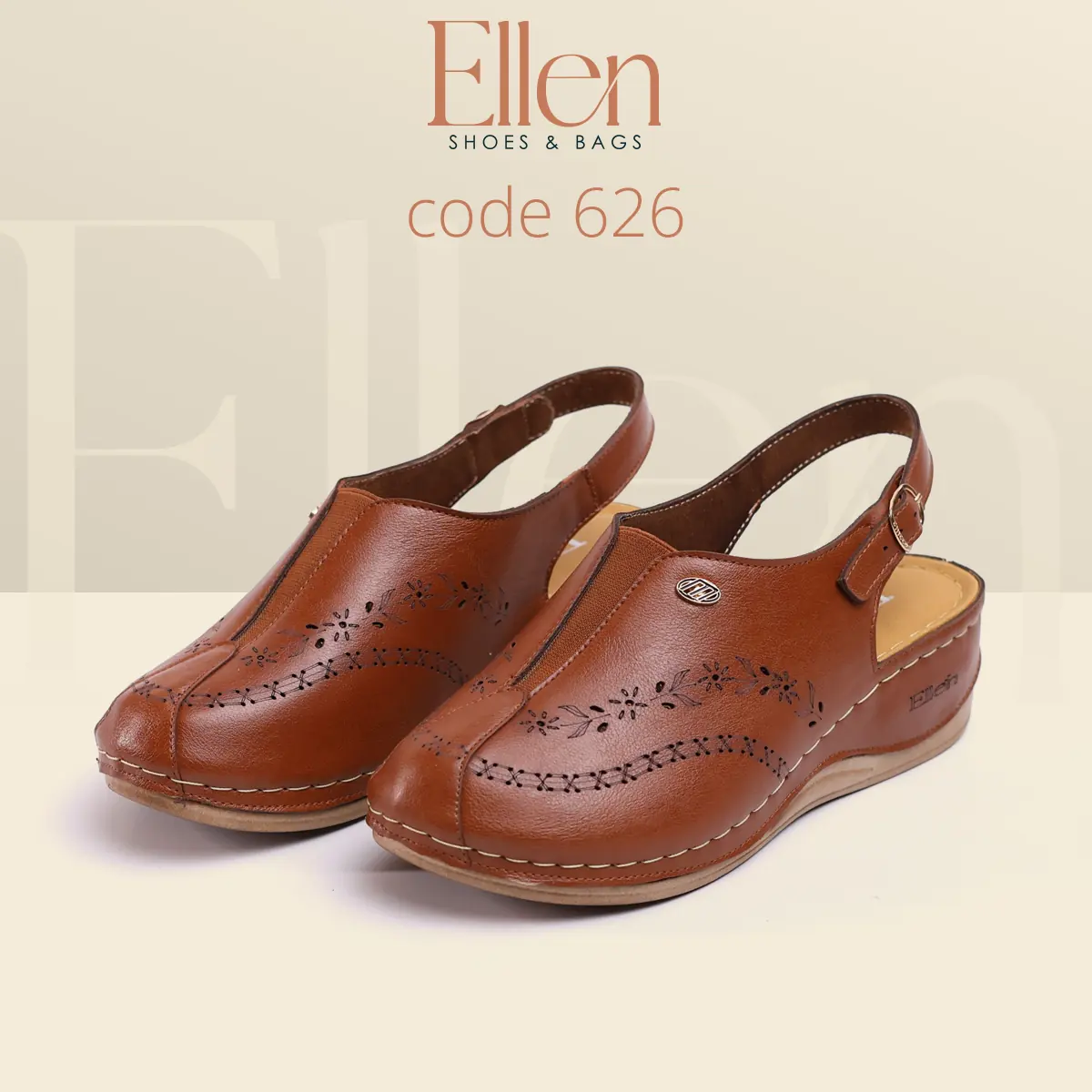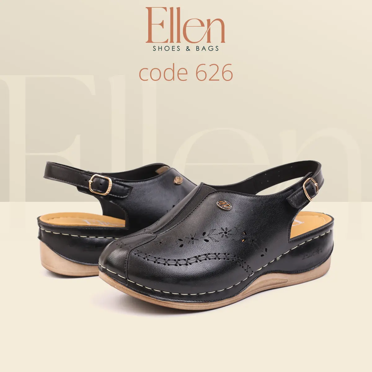سابوه Ellen كود 626 معمول للي بتحب الشكل الأنيق اللي يبان راقي من أول نظرة، وفي نفس الوقت عملي جدًا في اللبس اليومي بحزام خلفي. خامة الجلد شكلها غني، وتفاصيل الحفر الليزر مدياله لمسة أنثوية شيك، مع كعب متوسط يديك حضور من غير مبالغة.