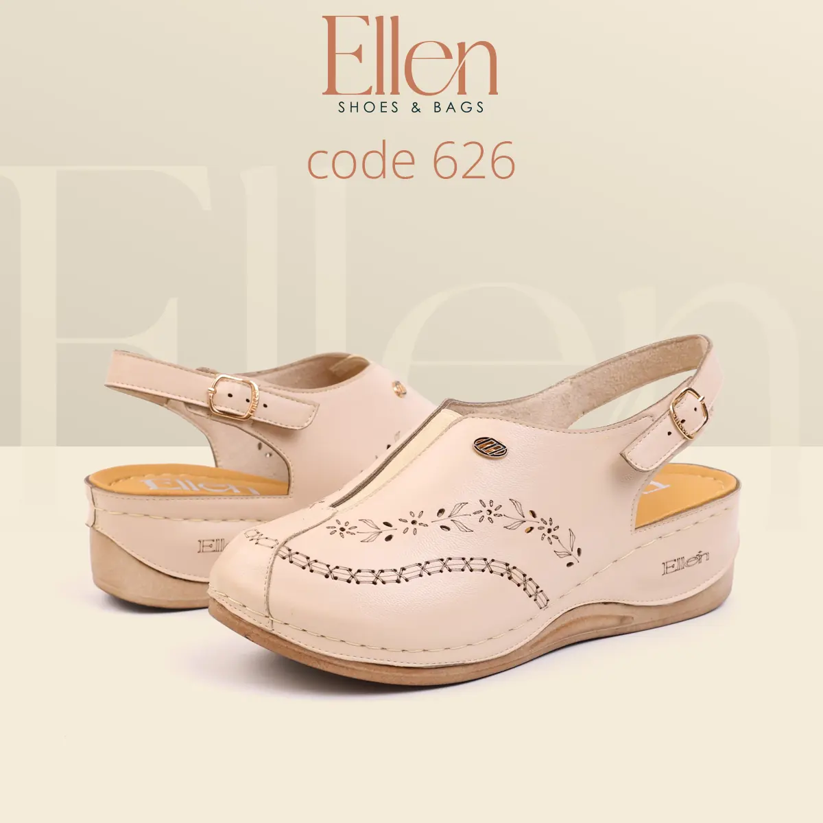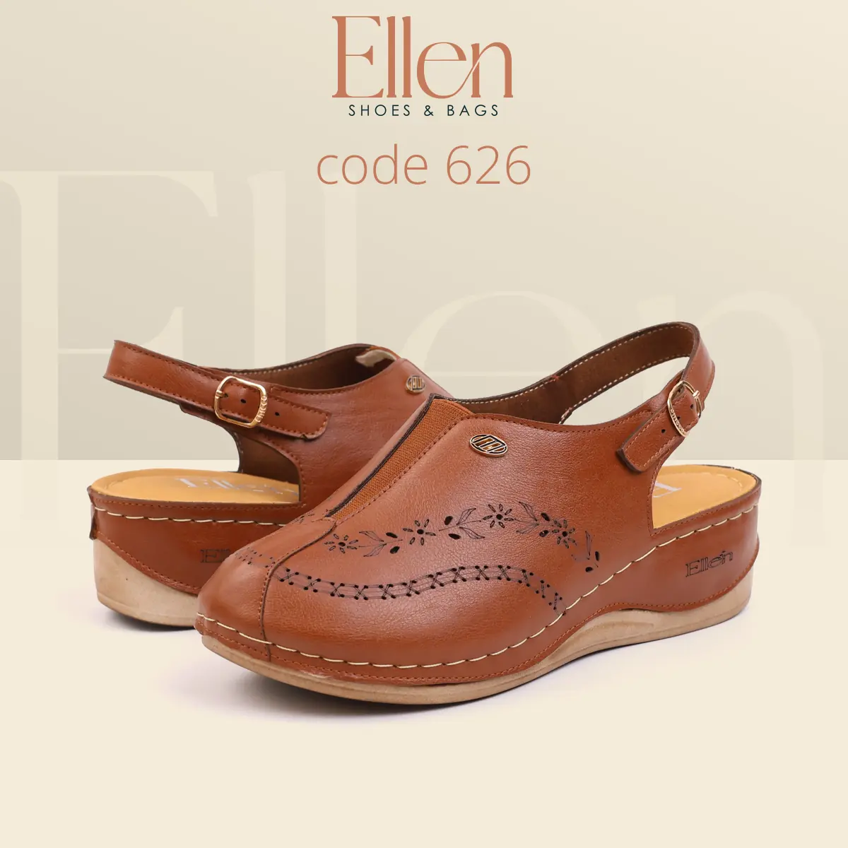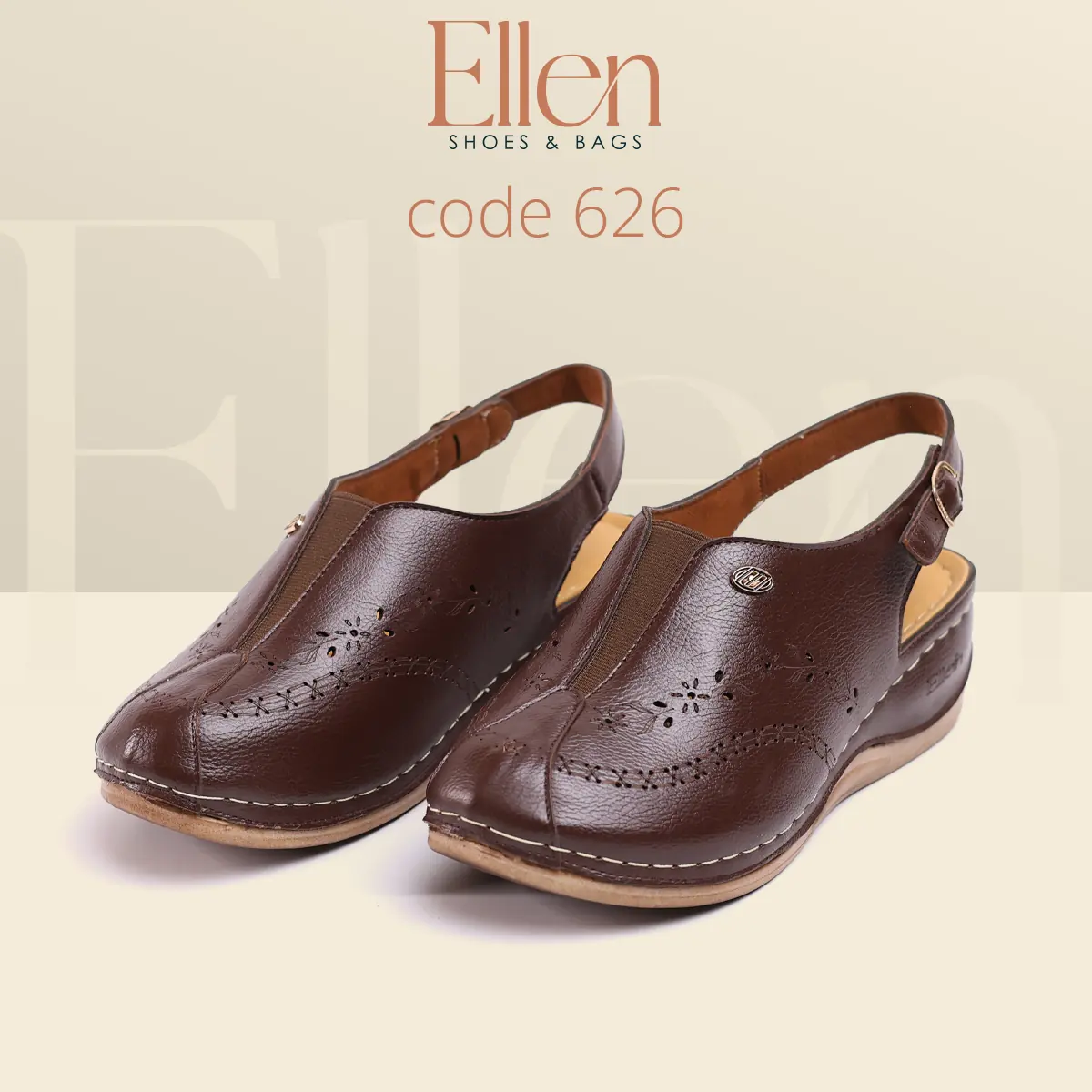 سابوه Ellen كود 626 معمول للي بتحب الشكل الأنيق اللي يبان راقي من أول نظرة، وفي نفس الوقت عملي جدًا في اللبس اليومي بحزام خلفي. خامة الجلد شكلها غني، وتفاصيل الحفر الليزر مدياله لمسة أنثوية شيك، مع كعب متوسط يديك حضور من غير مبالغة.