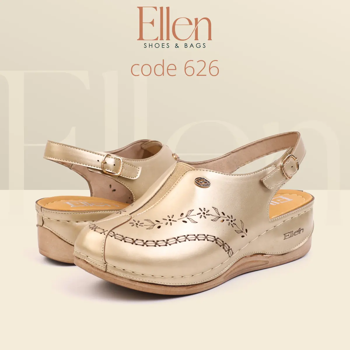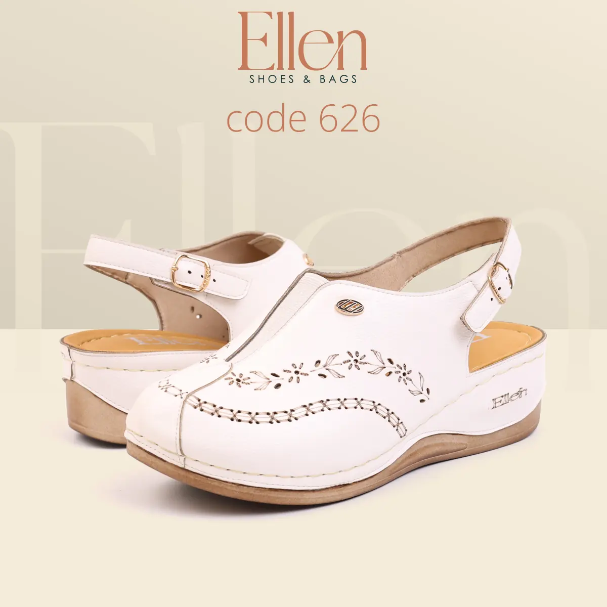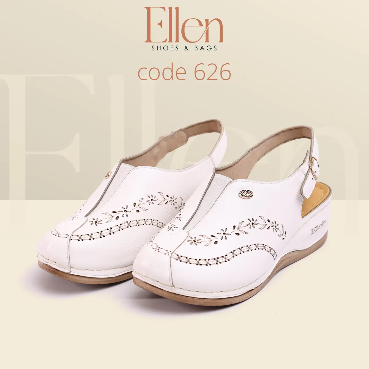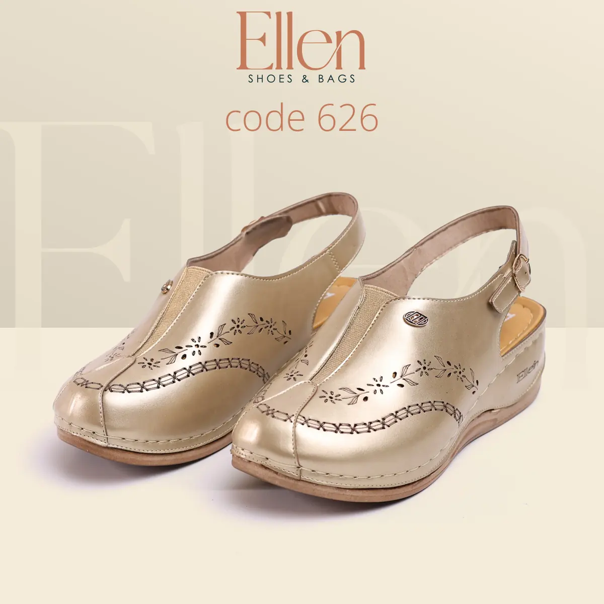 سابوه Ellen كود 626 معمول للي بتحب الشكل الأنيق اللي يبان راقي من أول نظرة، وفي نفس الوقت عملي جدًا في اللبس اليومي بحزام خلفي. خامة الجلد شكلها غني، وتفاصيل الحفر الليزر مدياله لمسة أنثوية شيك، مع كعب متوسط يديك حضور من غير مبالغة.