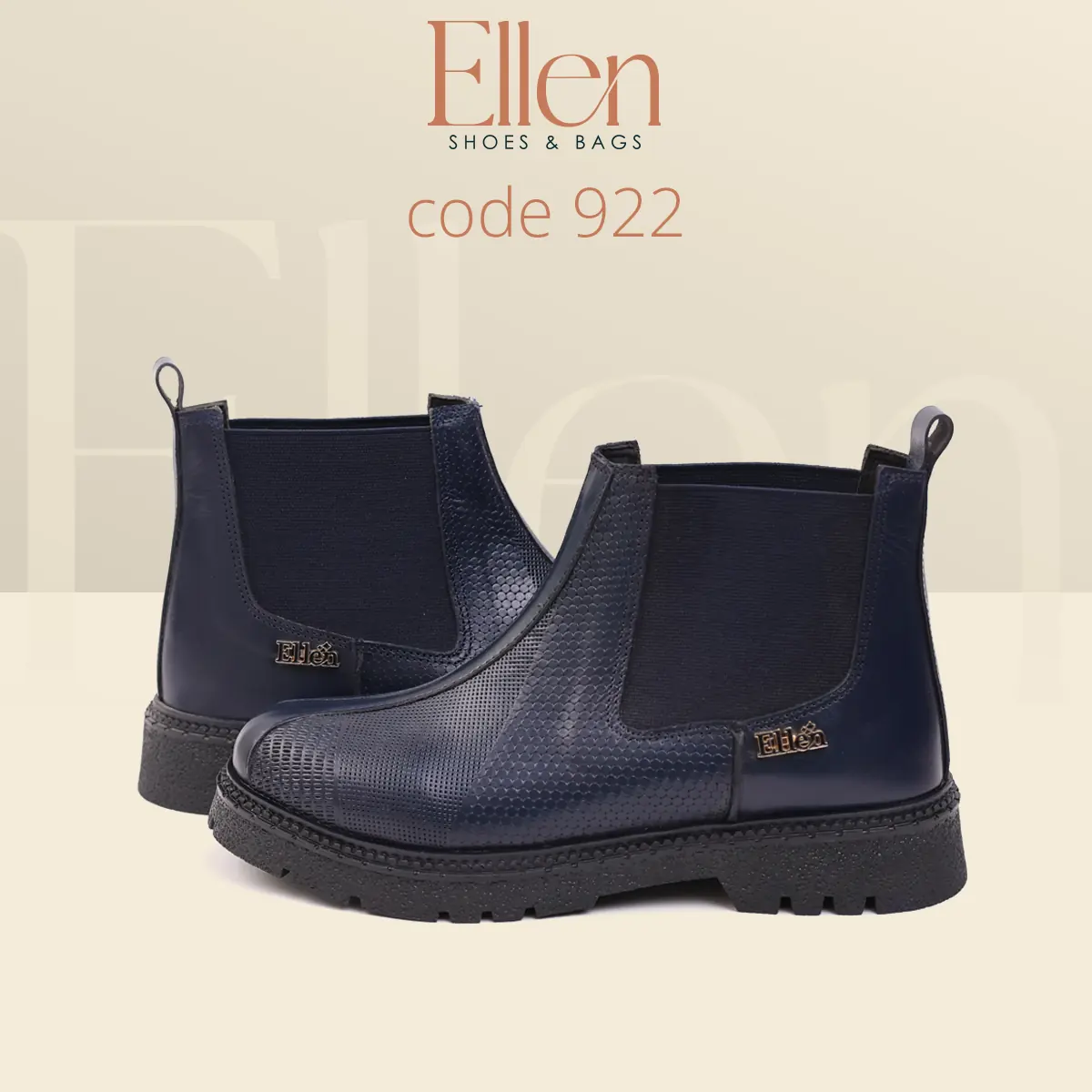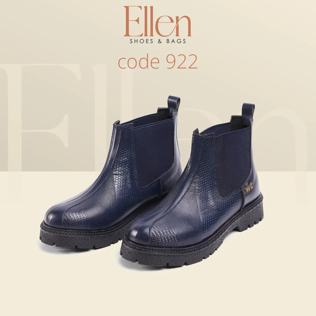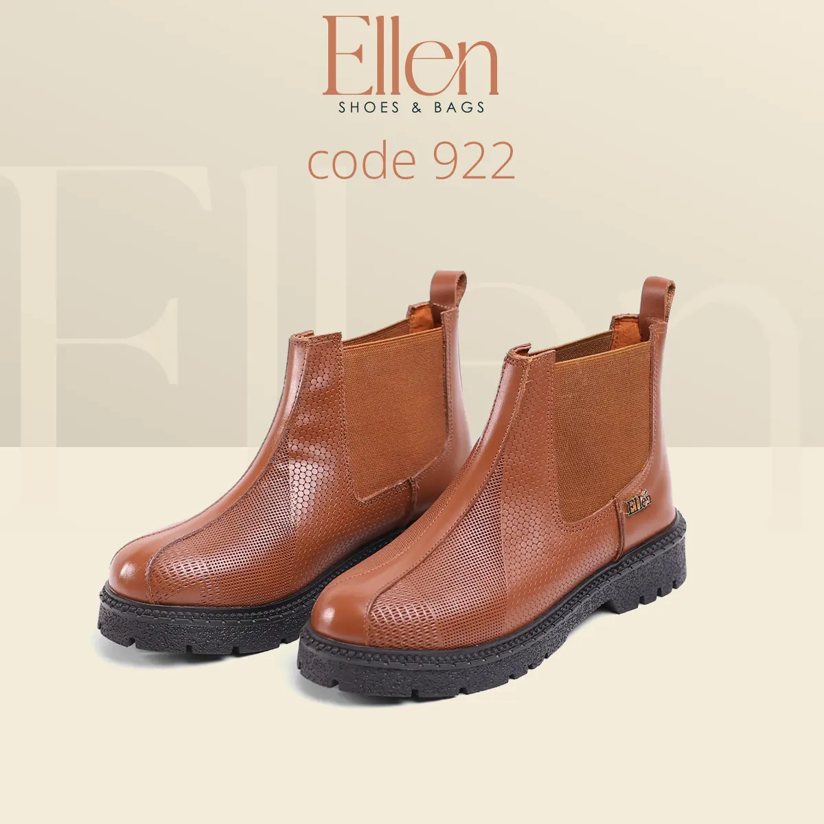 لو بتحبي البوتات اللي شكلها راقي وتدي حضور من غير ما تبقى تقيلة على اللوك، هاف بوت Ellen كود 922 معمول علشانك. جلد طبيعي مطبوع بتكسچر واضح يبان فخم من أول نظرة، مع لمسة إكسسوار معدني بسيط يدي Signature شيك… وكله على نعل فوم عملي يناسب يومك.