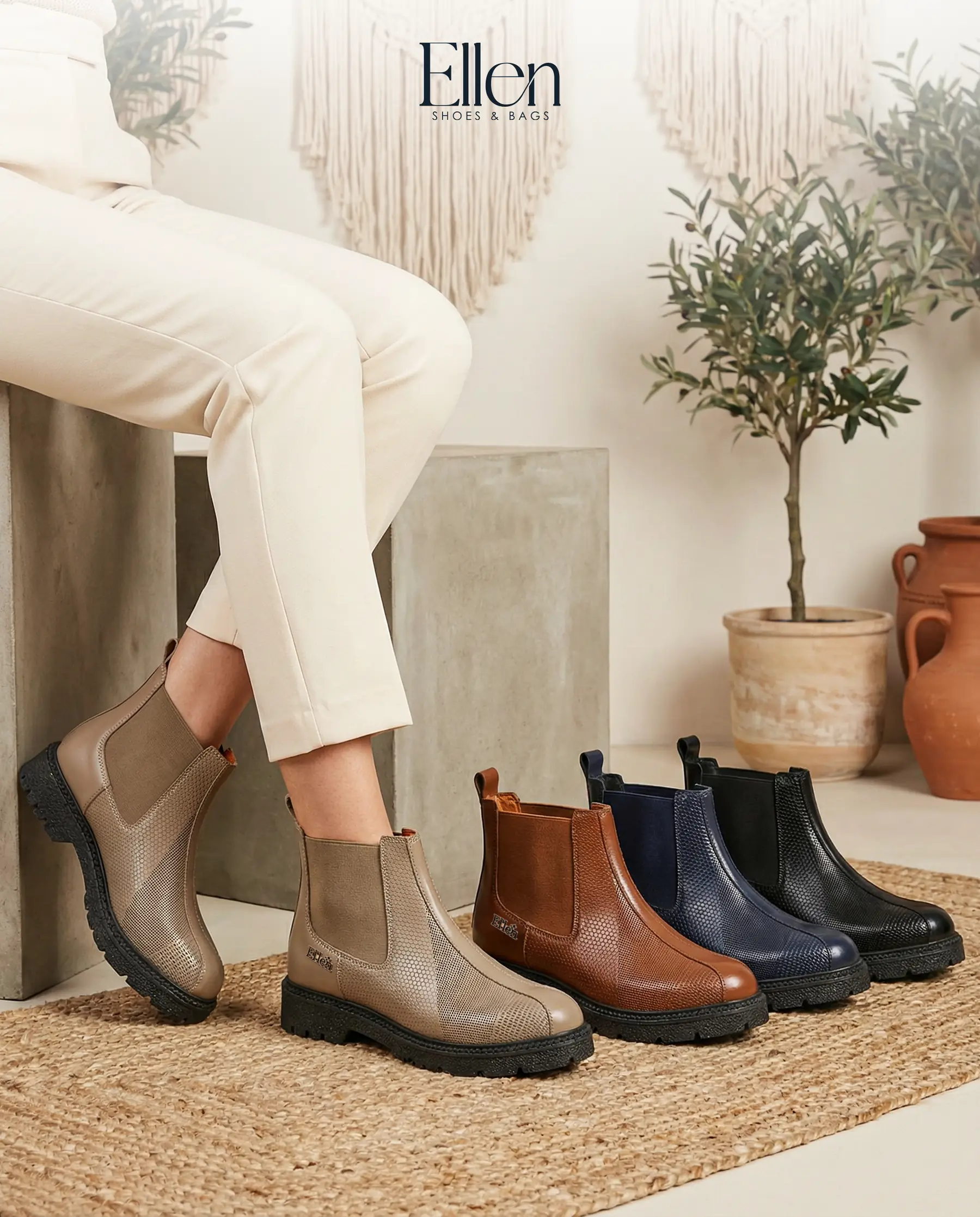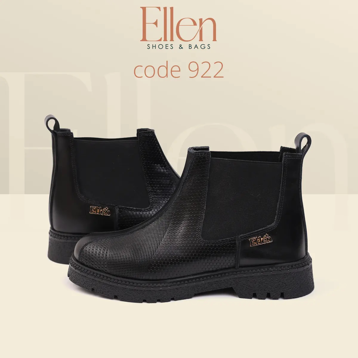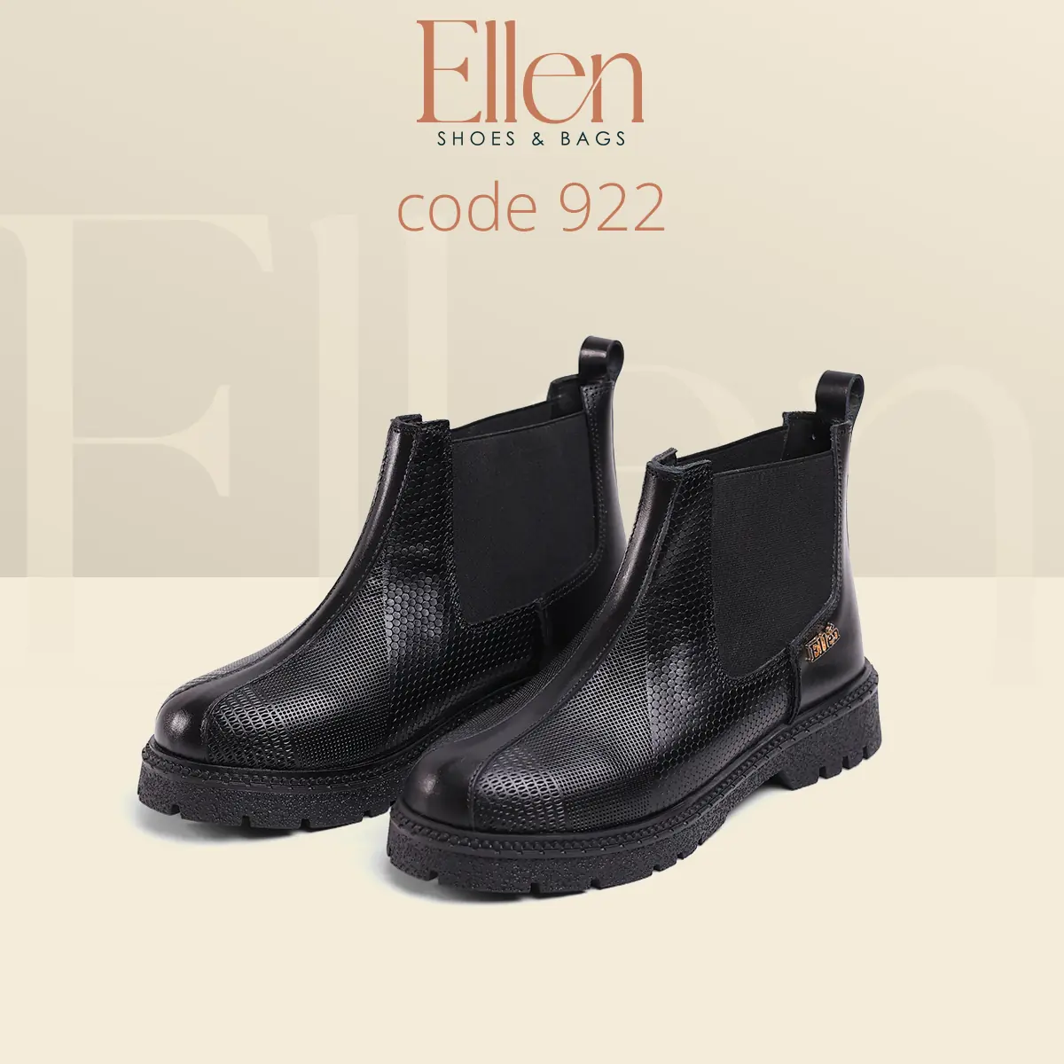 لو بتحبي البوتات اللي شكلها راقي وتدي حضور من غير ما تبقى تقيلة على اللوك، هاف بوت Ellen كود 922 معمول علشانك. جلد طبيعي مطبوع بتكسچر واضح يبان فخم من أول نظرة، مع لمسة إكسسوار معدني بسيط يدي Signature شيك… وكله على نعل فوم عملي يناسب يومك.